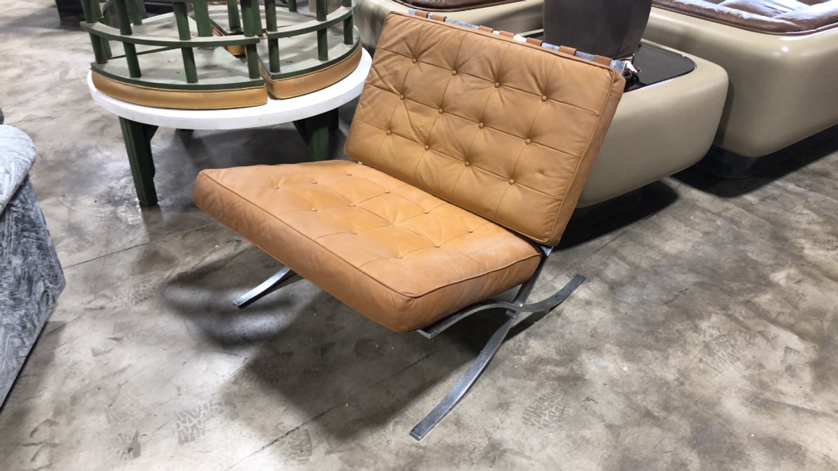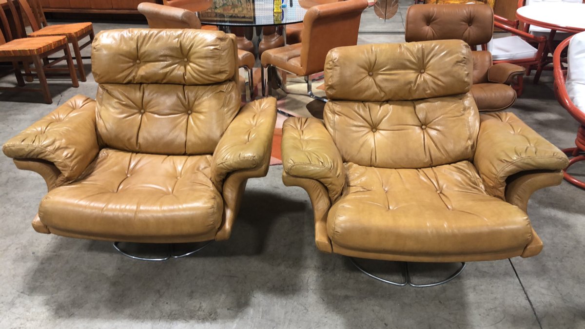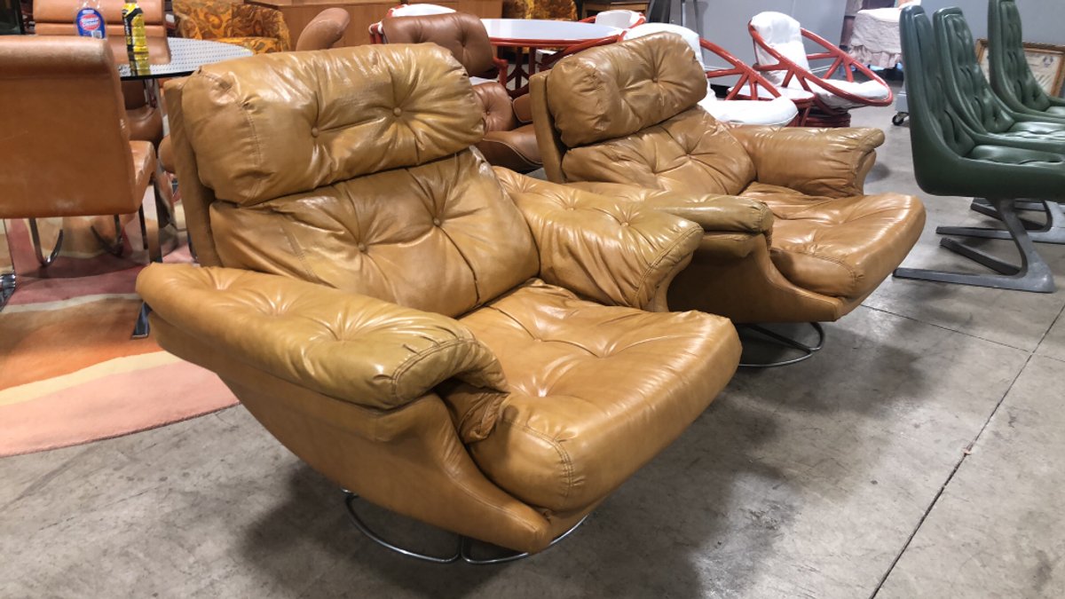 - (2) Selig Tufted Tan Leather Swivel Lounge Chairs with chrome fan base