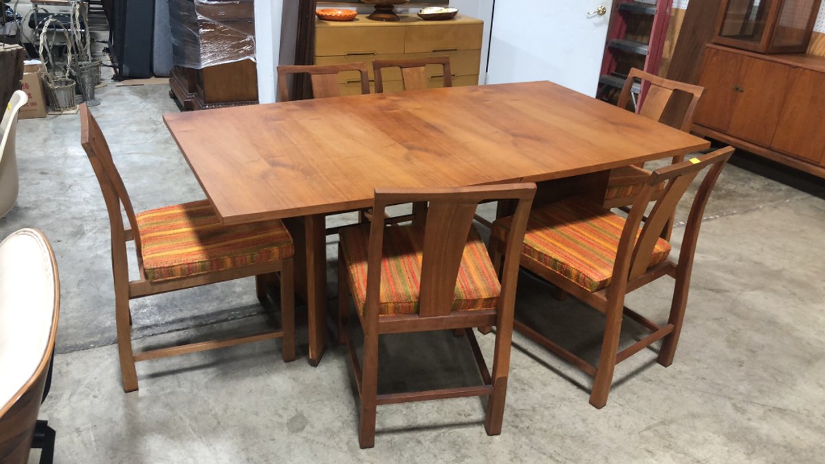 - Danish Modern Hibriten Chair Walnut Dining Suite including Table and 6-chairs; Buffet with Lighted Curio
