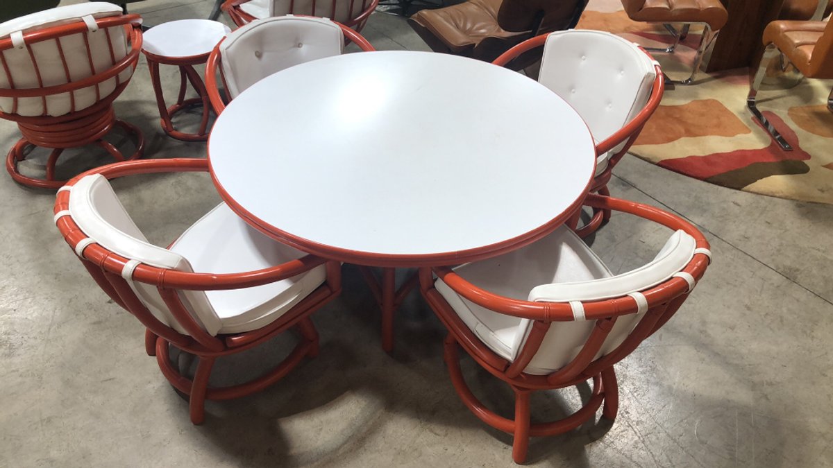 - Custom painted rattan 8-pc patio set with white leather cushions