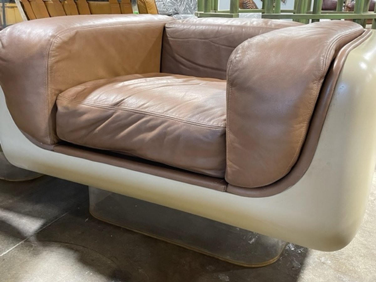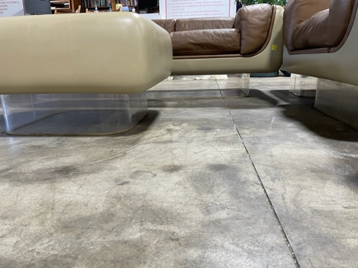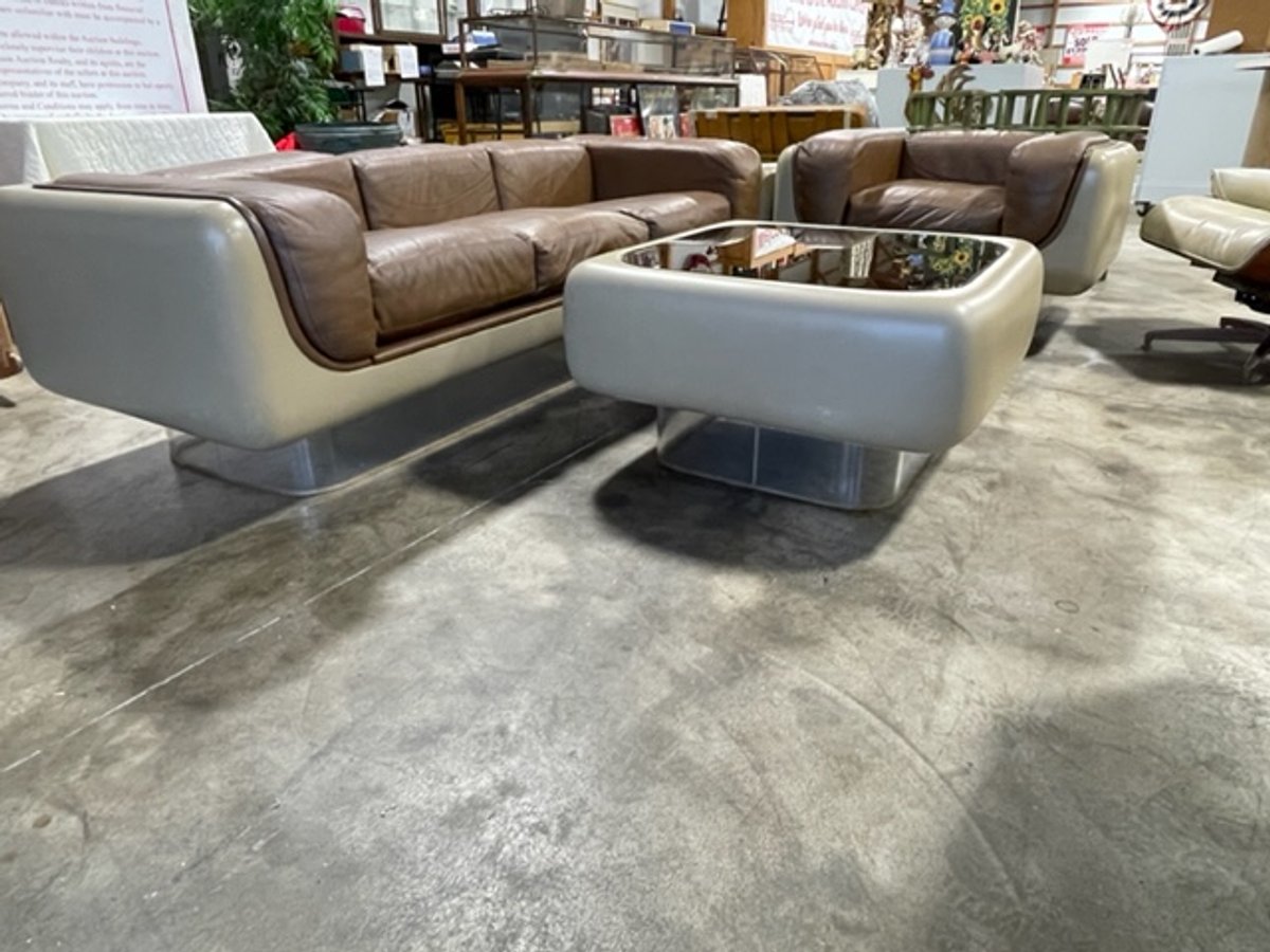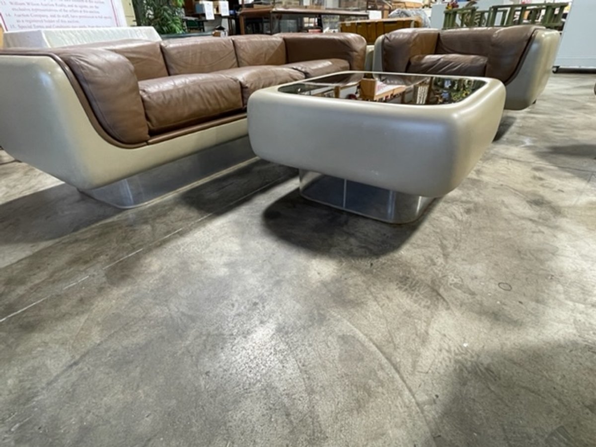 - Vintage Original William Andrus Steelcase Lounge Suite: #465 Soft Seating Sofa, Chair, and (2) Tables -- Space Age four piece Steelcase living room set as designed by William Andrus for the 465 soft seating line, 1972. Signature floating lucite recessed plinth base and rounded fiberglass casement shells. Three seat sofa, club chair, glass topped coffee and side tables.