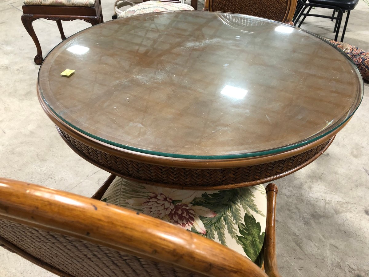 - RATTAN DINETTE SET WITH GLASS TOP TABLE AND (4) CHAIRS