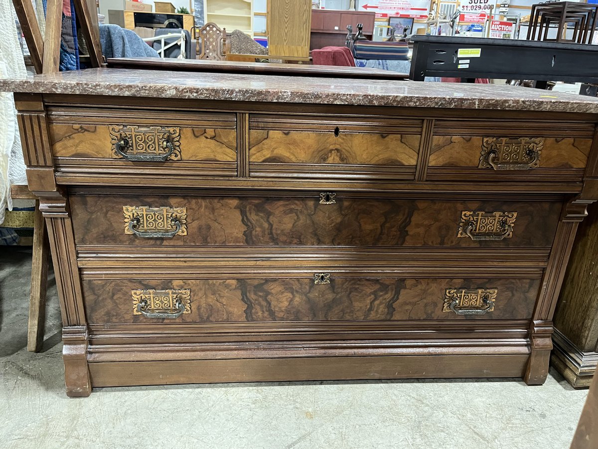 - VICTORIAN BURL FRONT CHEST WITH MARBLE TOP