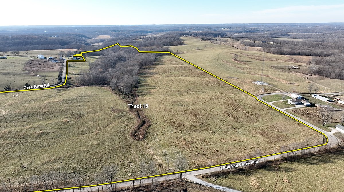 Tract 13: 91 ± ac; pasture and wooded acres; IMPROVEMENTS: Brick Ranch House and Barn; frontage along Ozee Farm Road and Little Salt Creek Run