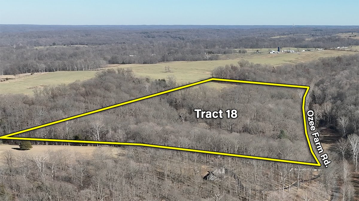 Tract 18: 22 ± ac; mostly wooded; frontage along Ozee Farm Road; IMPROVEMENTS: House and barn